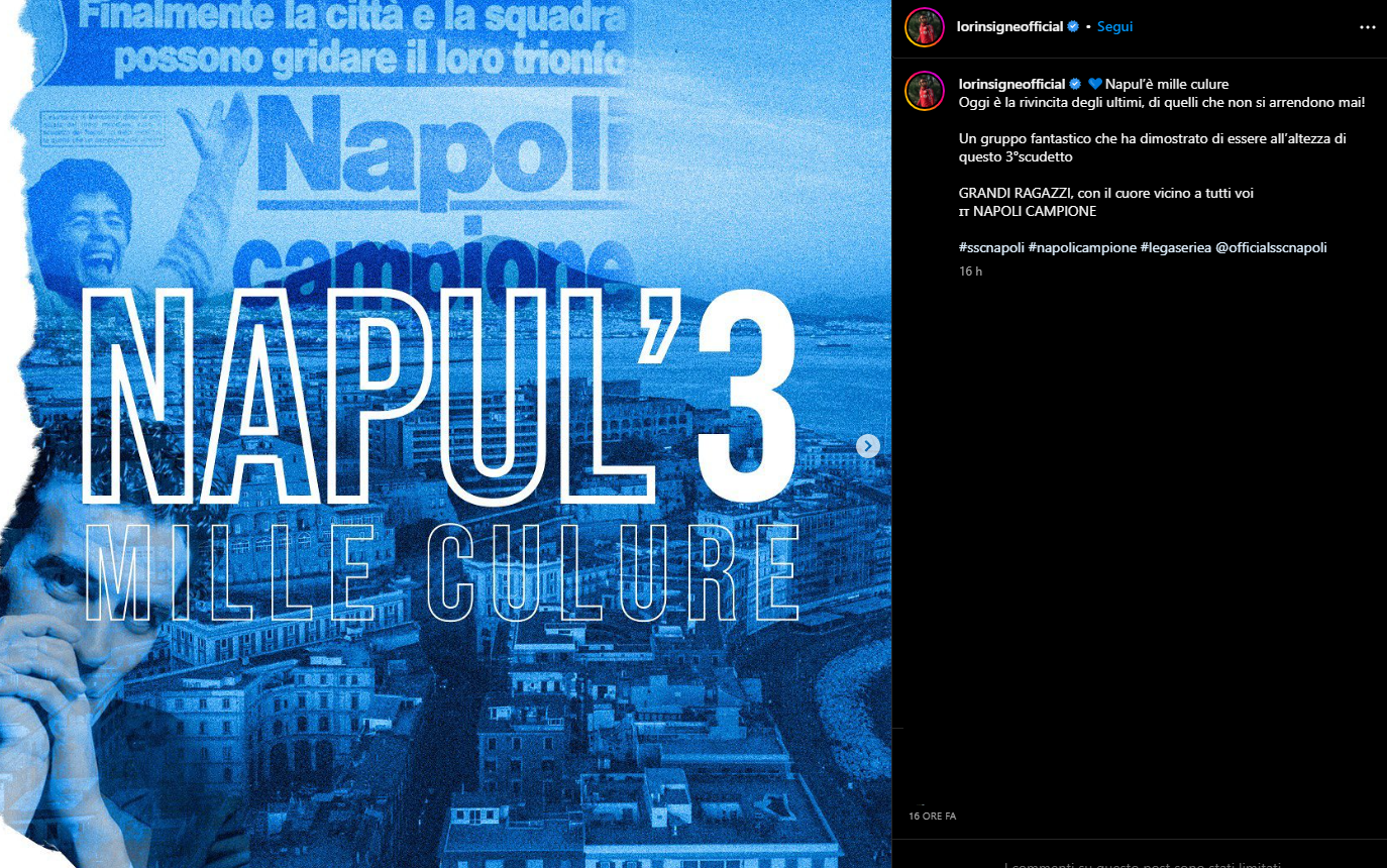 © instagram|Lorenzo Insigne: "Napul'è mille culure. Un gruppo fantastico che ha dimostrato di essere all'altezza di questo terzo scudetto. Grandi ragazzi, con il cuore vicino a tutti voi, Napoli campione".