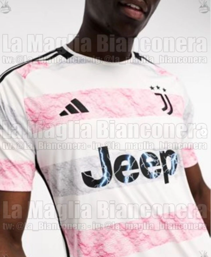 La pagina "La Maglia Bianconera" ha svelato la divisa da trasferta che la Juventus utilizzerà nella stagione 2023/2024. Si tratta di una maglia bianco-rosa, con inserti neri e grigi e la parte retrostante bianca. Il motivo richiama il tono su tono del Monte Rosa. Il pantaloncino è nero.