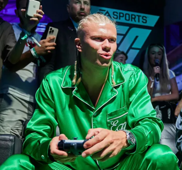 Erling Haaland sarà il volto del videogioco calcistico di EA Sports, e per la presentazione ha preparato un originalissimo vestiario verde smeraldo dalla testa ai piedi. Il centravanti del City ha partecipato all'evento in compagnia di altri campioni come Ronaldinho, Figo e Drogba.