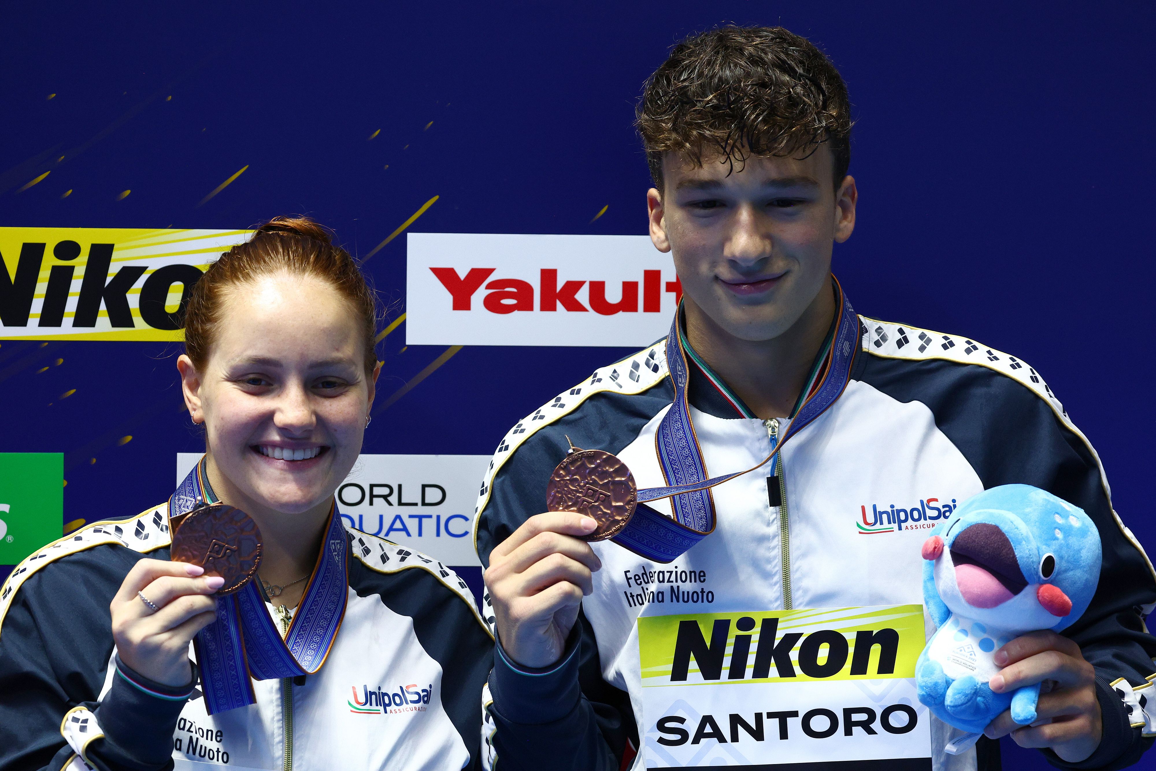 Chiara Pellacani e Matteo Santoro hanno regalato all'Italia la settima medaglia ai Mondiali di nuoto in corso in Giappone. I due azzurri hanno centrato il bronzo trampolino sincro misto 3 metri dietro ai colossi Cina e Australia. Grande la gioia dei protagonisti in occasione della premiazione: ecco le immagini più belle.