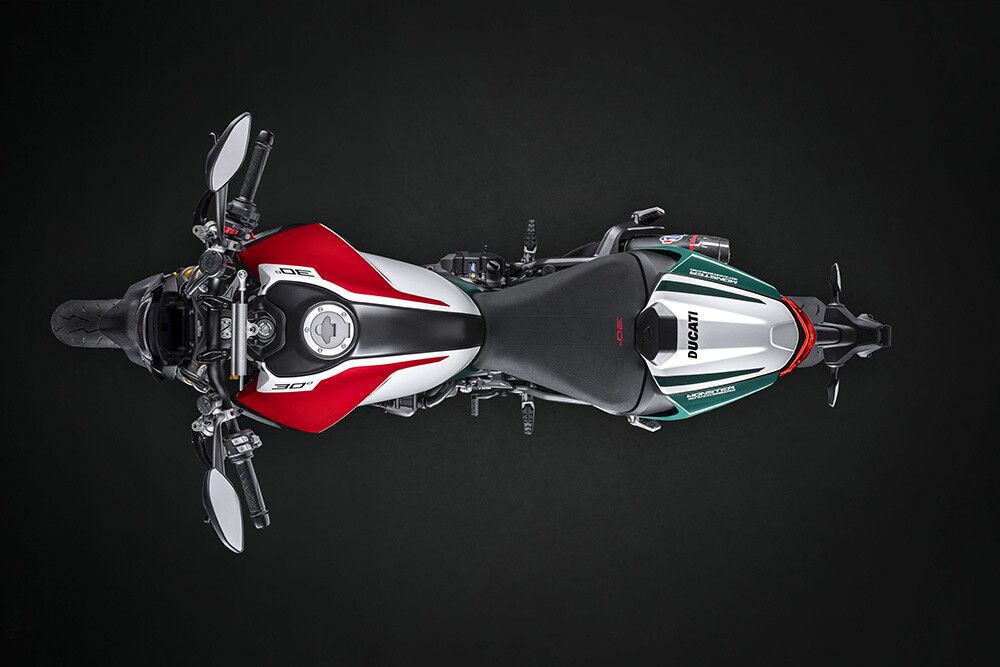 Ducati celebra i 30 anni del Monster con un modello in serie numerata e limitata a 500 unità. La versione Monster 30° Anniversario è l’omaggio della Casa di Borgo Panigale a una moto che ha rivoluzionato il mondo delle due ruote e che dal 1993 a oggi ha conquistato la passione di oltre 350.000 Monsteristi in tutto il mondo. Il Monster è da sempre questo: un motore sportivo, perfetto per l’uso stradale, ciclistica derivata dalla Superbike, manubrio largo e niente carenatura. Un’idea tanto semplice quanto efficace, che ha permesso di realizzare la moto che ha reinventato il segmento delle naked e che nel corso degli anni si è evoluta più volte rimanendo sempre fedele all’idea originale. Anche questa versione speciale mantiene le caratteristiche iconiche dei modelli Monster: uno stile inconfondibile e il massimo del divertimento su strada. La sua natura si coglie fin dal primo sguardo grazie alla livrea Tricolore 30° Anniversario ispirata ai Monster più sportivi del passato. Questa livrea celebra il made in Italy di cui Ducati è ambasciatrice ed è impreziosita dal colore oro dei cerchi, appositamente realizzati per questo modello e della forcella Öhlins NIX30. Altri elementi distintivi di questo modello sono poi la sella impreziosita dal logo ricamato dei 30 anni e l’animazione dedicata del dashboard che si avvia all’accensione del quadro. Ogni moto è infine resa unica da una placca sulla piastra di sterzo con riportato nome del modello e numero dell’esemplare, certificato di autenticità e telo copri moto dedicato. Il Monster 30° Anniversario è equipaggiato con componenti che, oltre ad esaltarne l’estetica, migliorano anche le doti dinamiche e che permettono di raggiungere un peso in ordine di marcia di 184 kg, ovvero 4 kg in meno rispetto al modello standard, già riferimento della categoria per leggerezza. Questo traguardo è ancora più di valore se si considera che rispetto al modello standard sono stati aggiunti componenti, e quindi peso, quali l’ammortizzatore di sterzo e il cupolino. Il Monster, reinterpretazione in chiave moderna della ricetta originale, è una moto leggera, facile, maneggevole e veloce. È spinto dal motore Testastretta 11°, un bicilindrico 4 valvole raffreddato a liquido con distribuzione desmodromica da 111 cavalli. Un motore estremamente affidabile e poco impegnativo dal punto di vista della manutenzione, grazie a intervalli di manutenzione principali molto dilazionati nel tempo (15.000 km per il cambio olio e 30.000 km per il controllo gioco valvole). Ha una curva di erogazione piena a tutti i regimi, in particolare a quelli medio bassi, i più utilizzati su strada. Questo significa motore più pronto, che si traduce in maggior piacere di guida. Estremamente razionale ed efficace, la ciclistica del nuovo Monster trasporta i principi ispiratori delle Superbike Ducati su una moto stradale. Il motore è portante, e a lui si collega un telaio Front Frame che concettualmente riprende quello della Panigale V4. Le sospensioni Öhlins, completamente regolabili, vantano una forcella più leggera di 0,6 kg rispetto a quella adottata su Monster e Monster+, migliorano il feeling, oltre ad aumentare la luce a terra e di conseguenza l’angolo di piega. Il setup delle sospensioni è sportivo, e questo permette al Monster 30° Anniversario di regalare grande divertimento quando si guida nel misto stradale, ma anche fra i cordoli di un circuito. La dotazione Öhlins è completata con l’ammortizzatore di sterzo regolabile che aumenta la precisione e il rigore ai ritmi più elevati. L’impianto frenante è caratterizzato da pinze anteriori Brembo Stylema® (più leggere di 0,4 kg rispetto alle unità montate sul Monster) e flange in alluminio per i dischi freno anteriori da 320 mm (più leggere di 0,5 Kg rispetto alla dotazione del Monster) e rende il Monster 30° Anniversario più performante in staccata e più agile grazie alla riduzione dell’inerzia all’avantreno. L’agilità migliora ulteriormente grazie agli inediti cerchi forgiati, che riducono le masse non sospese di 1,86 kg, diminuendo il momento di inerzia della ruota anteriore del 21,8% e di quella posteriore del 26,9%. L’elettronica del Monster è ai vertici del segmento. La dotazione di serie comprende ABS Cornering, Ducati Traction Control e Ducati Wheelie Control, tutti regolabili su diversi livelli di intervento. Il carattere sportivo del nuovo Monster 30° Anniversario è sottolineato anche dal Launch Control che assicura partenze fulminee. Questo equipaggiamento da moto top di gamma, che comprende anche l’adozione di una batteria al litio che contribuisce alla riduzione del peso totale della moto, permette al Monster 30° Anniversario di esprimere in sicurezza le proprie performance. I tre Riding Mode - Sport, Road e Wet - consentono di plasmare il carattere del Monster secondo i gusti e le necessità del pilota. Tutto è facilmente gestibile attraverso i comandi al manubrio e il cruscotto TFT a colori da 4,3”, caratterizzato da una grafica racing che riprende quella della Panigale V4, con un grande contagiri e una serie completa di informazioni sulla sinistra, fra cui quella della marcia inserita. Il Ducati Monster 30° Anniversario arriverà nelle concessionarie della rete Ducati a partire da dicembre 2023.