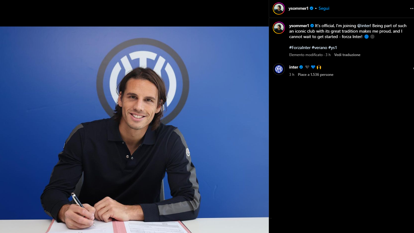 "È ufficiale, mi unisco all'Inter. Far parte di un club così iconico con la sua grande tradizione mi rende orgoglioso, e non vedo l'ora di iniziare - forza Inter". Così su Instagram il nuovo portiere dell'Inter Yann Sommer, allegando la foto che lo ritrae mentre firma il contratto che lo lega al club nerazzurro.