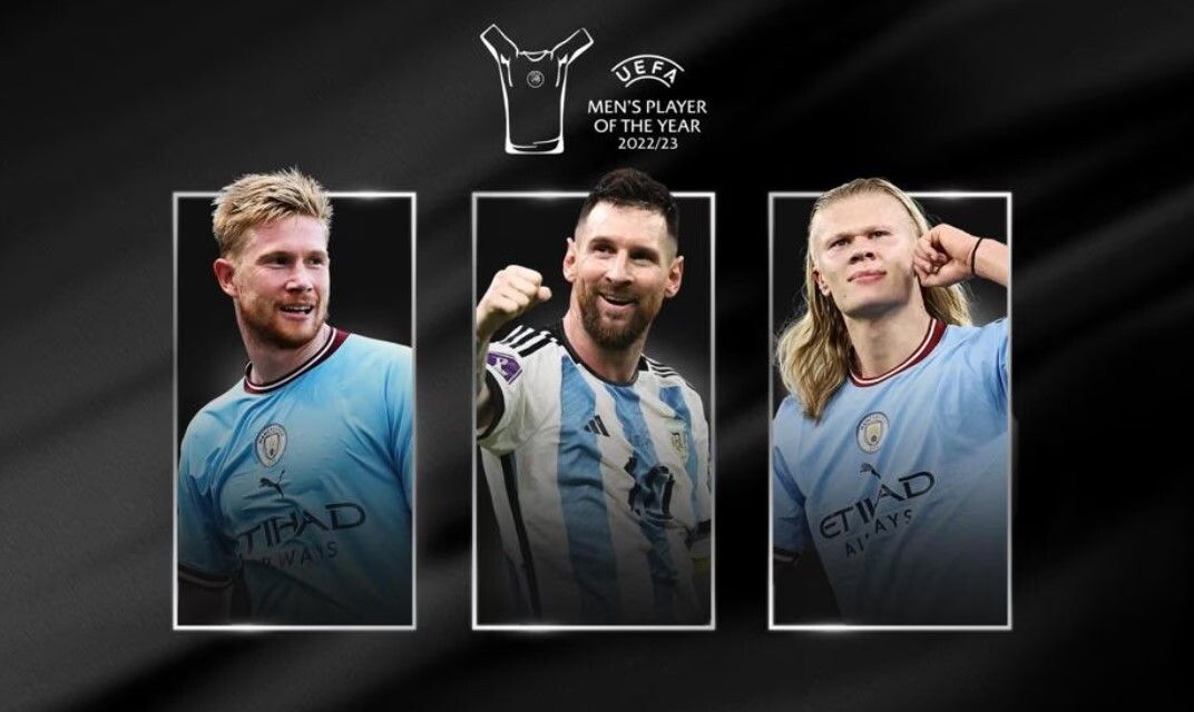 La Uefa ha annunciato i nomi dei tre finalisti per il premio di Giocatore dell'Anno 2022/23. I tre finalisti, Kevin De Bruyne, Erling Haaland e Lionel Messi, sono stati decretati tramite votazione da una giuria composta dagli allenatori dei club che hanno partecipato alle fasi a gironi della Champions League, dell'Europa League e della Conference League 2022/23, insieme agli allenatori delle nazionali maschili delle federazioni affiliate alla Uefa. Ha fatto parte della giuria anche un gruppo di giornalisti selezionati dall'European Sports Media (ESM). Il vincitore verrà annunciato durante la cerimonia del sorteggio della fase a gironi della UEFA Champions League 2023/24, che si terrà giovedì 31 agosto al Grimaldi Forum di Montecarlo.