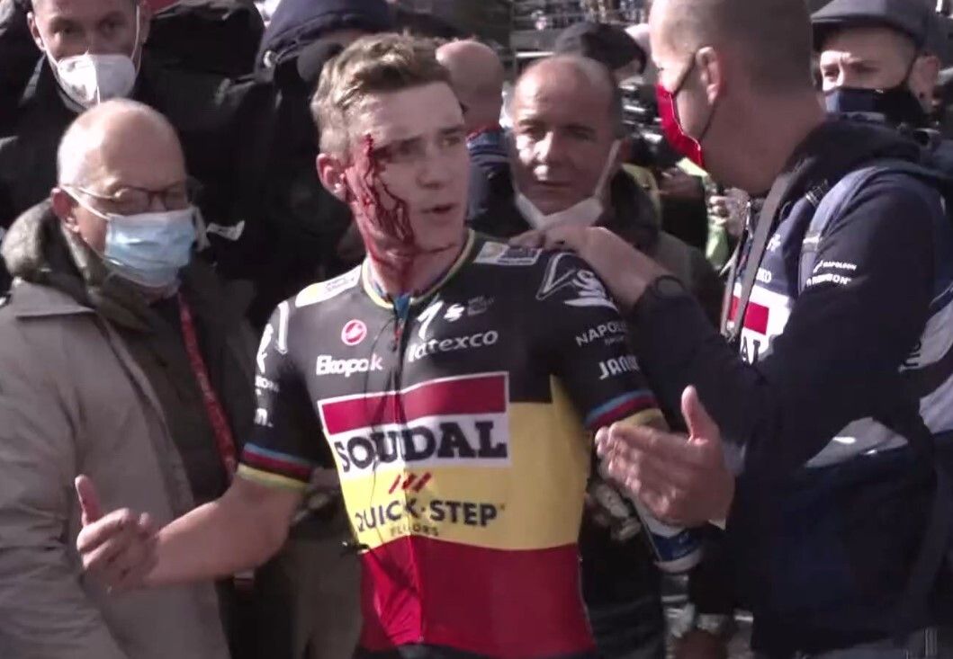 Evenepoel, maschera di sangue: scontro con una donna dopo il traguardo