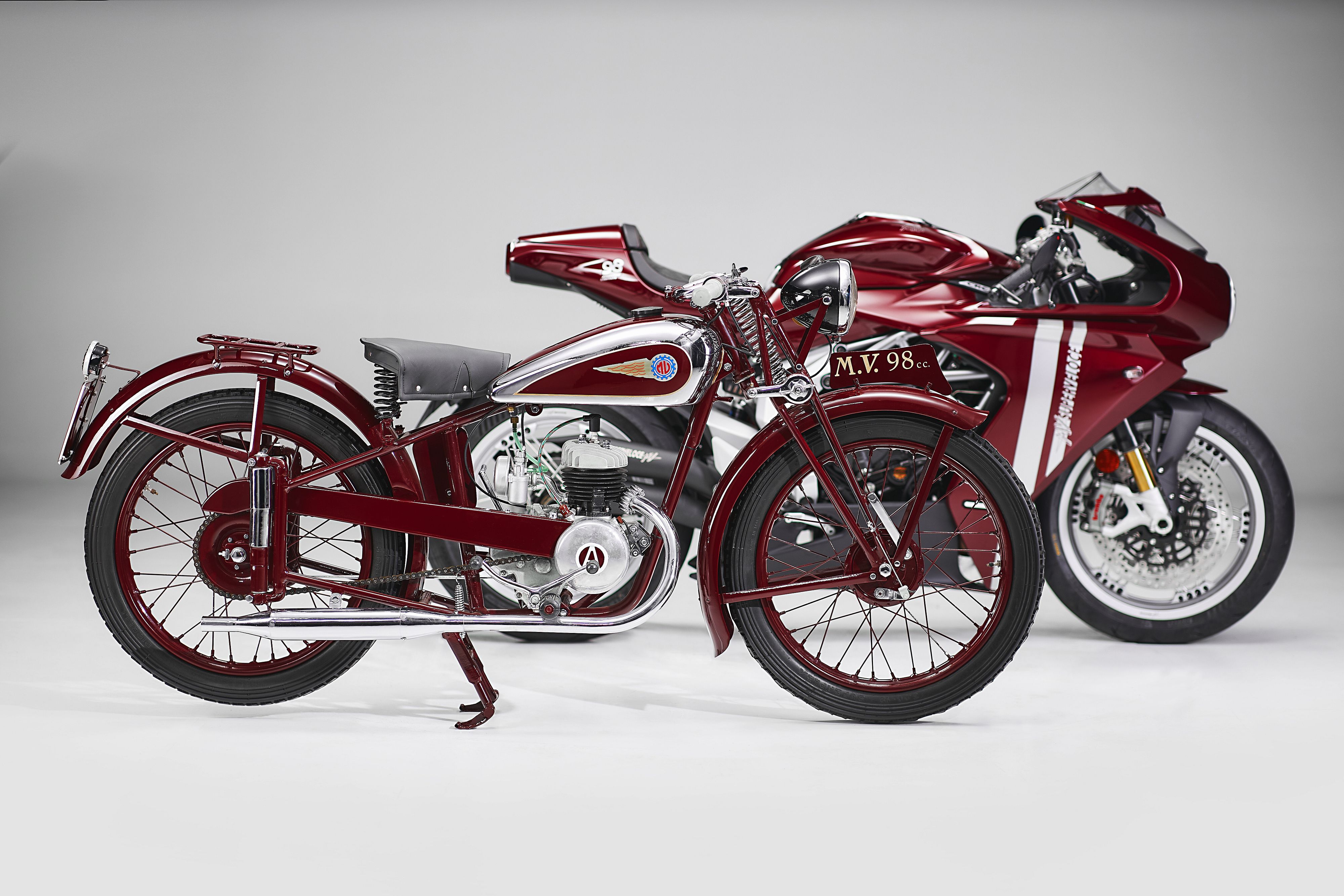 Nei primi anni Quaranta del secolo scorso in Italia la guerra rendeva la vita di tutti molto difficile, a partire dalle attività quotidiane. Spostarsi, ad esempio, nella sostanziale assenza di trasporto pubblico, era difficile e costoso. Per questo Domenico Agusta, che nel 1927, alla morte del padre Giovanni, aveva preso in mano l’azienda di famiglia, pensò alle moto come soluzione per rendere più semplici gli spostamenti e allo stesso tempo garantire un futuro a sé e ai dipendenti delle Officine Aeronautiche Giovanni Agusta. Nel 1943 vede la luce il primo motore MV Agusta: monocilindrico, 98 cc, dispone di un cambio a due velocità lubrificato. Leggero e compatto, va subito in produzione ma dopo poche settimane l’occupazione della fabbrica, nel settembre 1943, blocca tutto. Il progetto deve attendere l’immediato Dopoguerra, quando la fine delle ostilità permette di ripartire con l’assemblaggio della moto completa, la MV 98, che esordisce ammantata di un elegante colore bordeaux. Difficile ipotizzare le ragioni di una scelta cromatica decisamente insolita: forse le origini aristocratiche di Giovanni Agusta, che il figlio ha voluto omaggiare, o più semplicemente l’ispirazione del momento, il gusto personale. Di sicuro la scelta del bordeaux regala una notevole eleganza a una moto pronta a sfidare le strade disastrate di quegli anni. Oggi, 80 anni dopo la nascita del primo motore, la sigla "98" torna sulla carenatura di una MV Agusta: è la Superveloce 98 Edizione Limitata, prodotta in soli 300 esemplari numerati e immediatamente riconoscibile grazie alla colorazione “Rosso Verghera”. Direttamente ispirato alla colorazione originale, il Rosso Verghera è un sofisticato prodotto di altissima qualità, la cui formula è stata sviluppata a livello sperimentale in CRC e poi industrializzata esclusivamente per MV Agusta. Applicato artigianalmente in molteplici fasi, il colore si compone di una base opaca bicomponente, abbinato ad uno strato lucido per una finitura che ne esalta i pigmenti metallici. Un tributo a una storia di successo, coraggio e intraprendenza che non sarebbe nemmeno iniziata senza la progettazione del motore 98, in quel lontano 1943. La sigla “98 Edizione Limitata” è posta lateralmente sul codino e poi nella sua parte superiore, affiancata al tricolore italiano, che rimarca l’irrinunciabile origine “Made in Italy” di ogni MV Agusta, costruita senza eccezioni nello stabilimento della Schiranna, sulle rive del lago di Varese. Il riferimento storico alla cilindrata del motore progettato nel 1943 e alla tiratura in serie limitata fa bella mostra anche sulla piastra di sterzo, grazie alla tecnologica incisione laser, ed è rimarcata dal certificato di autenticità, consegnato all’acquisto della moto. La vocazione racing della Superveloce è stata importante fin dal lancio di questo modello e viene valorizzata anche nella Superveloce 98 Edizione Limitata, grazie al kit dedicato. In una confezione rigorosamente bordeaux sono contenuti il copricodino, un telo coprimoto specifico, il già citato certificato di autenticità e due pezzi pregiati: lo scarico a tre uscite Arrow, per l’uso esclusivo in pista e la centralina elettronica racing dedicata, perfetti per ottenere il massimo dal motore tre cilindri varesino. Il motore, appunto, è l’iconico tre in linea compatto e potente (147 CV) di 798 cc, che grazie all’estrema leggerezza contribuisce a contenere il peso della moto in soli 173 kg a secco, che scendono ulteriormente a 165 kg con il kit racing. Albero motore controrotante, camme trattate con rivestimento DLC per ridurre gli attriti e aumentare le prestazioni, valvole in titanio, cuscinetti dell’albero motore e delle bielle sviluppati per ridurre le perdite: sono tantissime le caratteristiche tecniche che rendono questo motore un esempio di efficienza e performance. A completare il quadro di assoluta eccellenza tecnica concorre l’intera dotazione della Superveloce 98 Edizione Limitata: i cerchi a raggi con finitura dorata, l’impianto frenante ottimizzato e alleggerito grazie alla pompa radiale Brembo PR 16/19 e alle pinze M4.30 Stylema anteriore, nonché servito dall’ABS Continental MK100 ricalibrato. E ancora il Ride by Wire migliorato grazie alla rotazione negativa della manopola dell’acceleratore; il pannello strumentazione da 5,5” TFT a colori, ampiamente personalizzabile e connesso allo smartphone; gli pneumatici ad alte prestazioni Pirelli Diablo Rosso IV Corsa e il sistema di localizzazione satellitare antifurto Mobisat. La Superveloce 98 Edizione Limitata, sarà disponibile in sole 300 unità, la maggior parte delle quali sono già state prenotate dai collezionisti più affezionati del marchio.