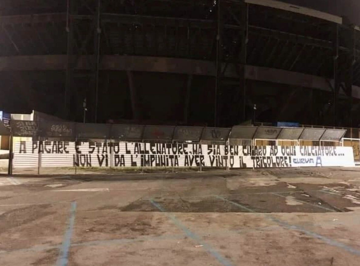 "A pagare è stato l'allenatore ma sia ben chiaro a ogni calciatore. Non vi dà l'impunità aver vinto il tricolore". Questo il testo del grande striscione che i tifosi del Napoli hanno appeso stanotte all'esterno dello stadio di Maradona, firmandolo Curva A. Uno striscione che esprime la forte delusione dei tifosi per questo avvio di stagione non solo su Garcia ma anche rispetto a prestazioni molto deludenti della stessa squadra che ha vinto lo scorso anno lo scudetto e quest'anno ha dimostrato importanti involuzioni nel gioco. Ora il rilancio del Napoli non è solo nelle mani del nuovo tecnico Mazzarri ma anche della squadra, ricordano gli ultras.