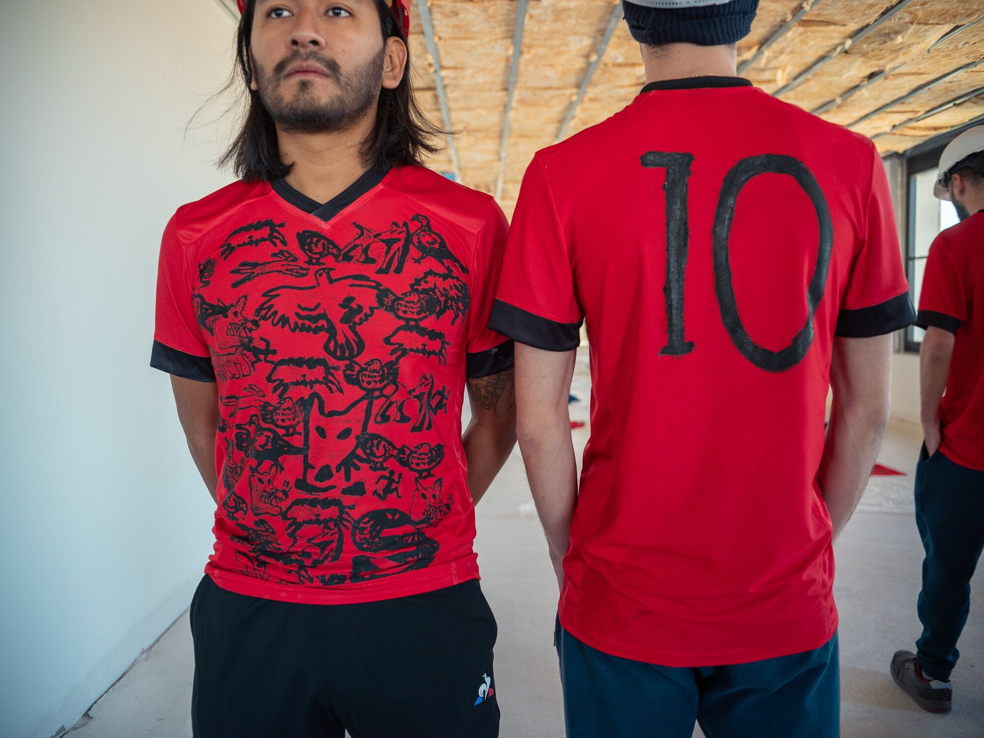 Definire l’arte è una missione impossibile, definire un’opera d’arte totale lo è ancor di più, soprattutto se quest’ultima ha bisogno di tacchetti per muoversi. Il Velasca è un’associazione sportiva dilettantistica creata dall'artista Wolfgang Natlacen e da altri quattro appassionati di sport e arte. È una squadra di calcio che unisce tutte le forme d’arte, dalla pittura alla musica… concreta. Nel Velasca, i giocatori e gli artisti che vengono chiamati in causa hanno il difficile compito di creare, creare in campo, creare fuori dal campo. Tutto viene pensato e ideato nei minimi dettagli, tutto viene fatto a regola d'arte: l’identità visiva, sonora, gli accessori, i biglietti e quindi le maglie. Le maglie sono la punta dell’Iceberg del Velasca. Ogni stagione il Velasca confida a un artista la creazione delle sue casacche. L’artista si sostituisce ai classici sponsor delle maglie calcistiche - che il Velasca non vuole - ed è totalmente libero di creare quello che desidera e come lo desidera anche grazie al sostegno di Le Coq Sportif al fianco del club da ormai 7 stagioni (una cosa questa, più che rara, mai vista). Régis Sénèque, Zevs, Jiang Li, Pascale Marthine Tayou, Francesca Belgiojoso, Kendell Geers, Joël Andrianomearisoa, Nada Pivetta e ora il duo artistico 75070 hanno dato vita a maglie uniche, pezzi da collezione, veri multipli artistici in edizione limitata e numerata che il Velasca mette a disposizione per i suoi tifosi e simpatizzanti. Il Velasca si diverte a stare fuori dai mercati, sia dal mercato dell’arte sia da quello del calcio. Per questa stagione il Velasca si è spinto oltre, chiedendo al duo artistico 75070 - contrazione dei codici postali di Parigi e Seoul, città da dove provengono Emmanuel Mousset et Woorim Moon - di creare 500 maglie uniche, 500 maglie originali. Niente serigrafia, niente sublimazione, niente riproduzione meccanica, quest’anno ogni maglia sarà una composizione originale. E così gli artisti hanno disegnato e concepito 14 timbri, raffiguranti i simboli animali di Milano e del Velasca, la scrofa semilanuta, il piccione, il biscione, il cane e l’uomo che corre. Ogni maglia è stata poi “timbrata” con questi animali per dare vita a un patchwork, un serraglio urbano. L’ultimo tocco è stato quello degli artisti, che coi loro pennelli hanno dipinto i numeri di maglia. Per omaggiare uno dei simboli architettonici di Milano e ispiratore del nome dell’Associazione, il progetto è stato sviluppato come una maratona di 10 ore iniziata eccezionalmente in torre Velasca, attualmente oggetto di un progetto di restauro conservativo, e conclusa allo Scalo Farini. Il Velasca ha aperto questo nuovo capitolo nel cantiere del 17esimo piano della Torre dove i giocatori del Velasca hanno potuto timbrare e creare le loro proprie maglie. Le maglie trasferta sono state invece realizzate allo spazio Lampo - Scalo Farini dove il pubblico poteva vedere in diretta gli artisti e i giocatori all’opera.