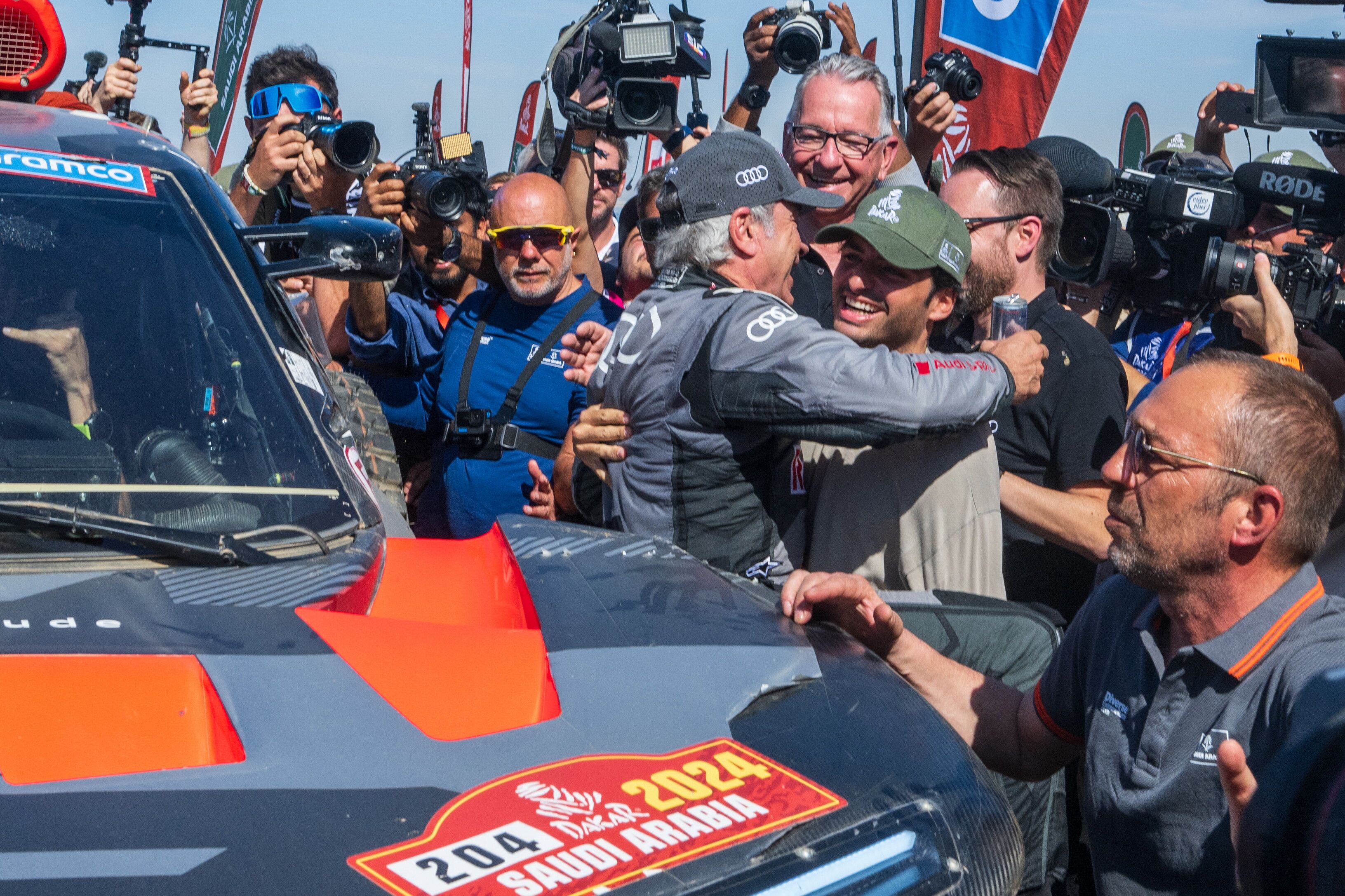 Carlos Sainz Jr. non poteva mancare all'arrivo della Dakar per l'abbraccio a suo papà Carlos. Il pilota della Ferrari, giunto a Yanbu, è stato il primo a celebrare il trionfo del 61enne.