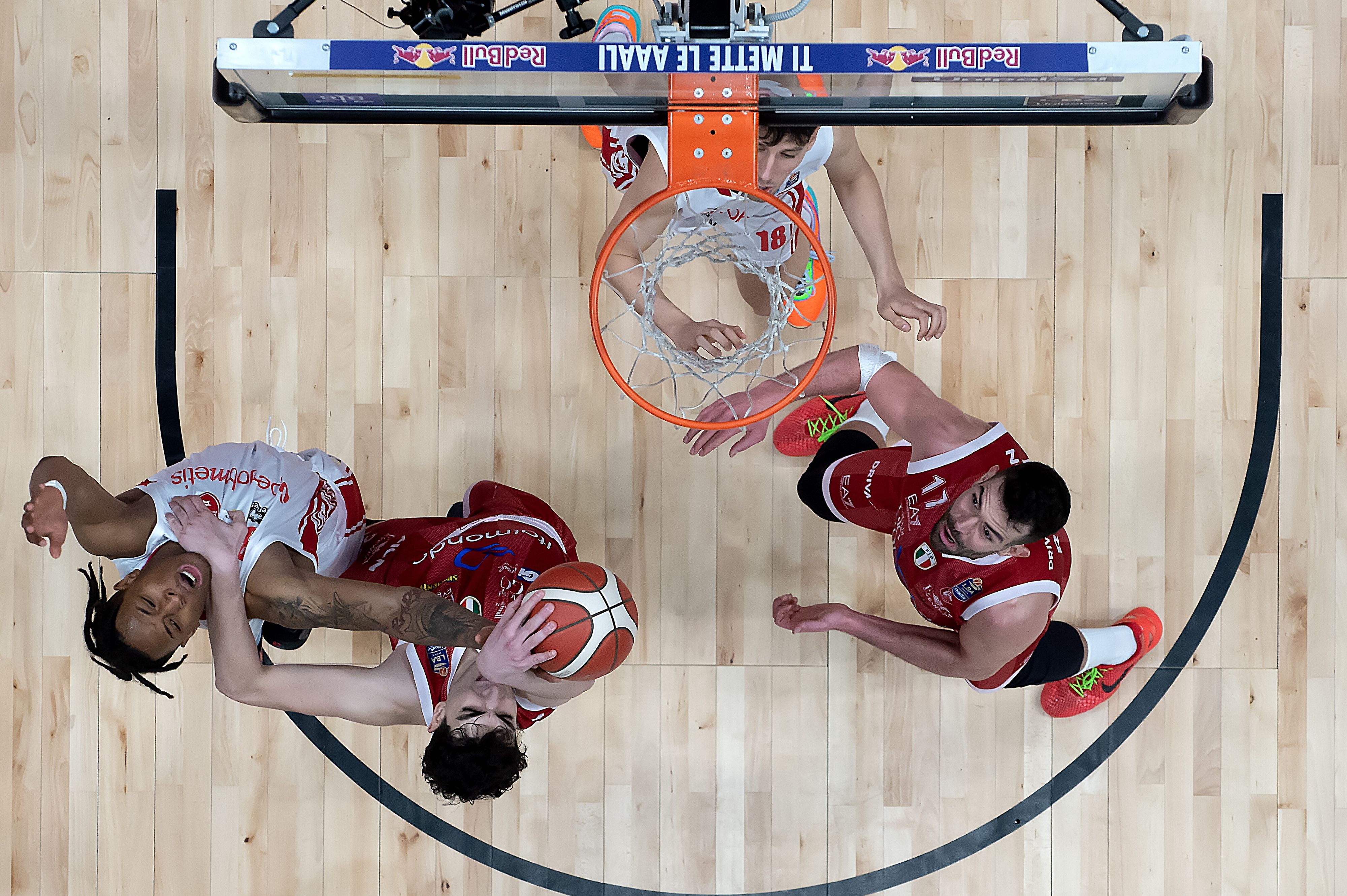 L'Olimpia Milano domina il derby contro Varese, aggancia Bologna e accorcia sulla capolista Brescia. Le foto più belle dal Forum con la Red Bull Energy Cam.