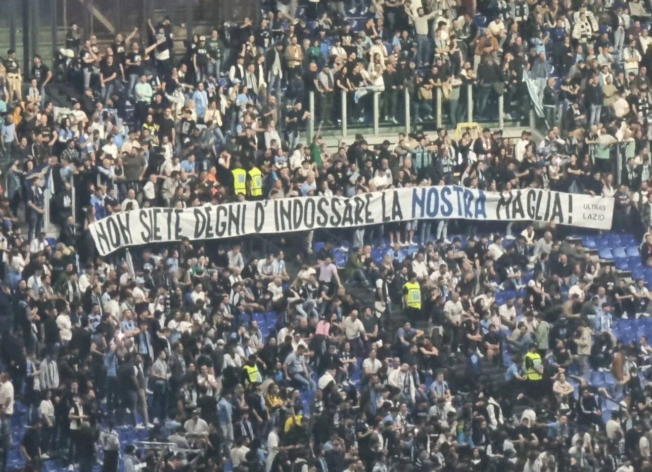 Dura contestazione da parte della Curva Nord nel pre-partita di Lazio-Salernitana. Dopo i fischi che hanno accompagnato tutto il riscaldamento e la lettura della formazione, il settore più caldo dello Stadio Olimpico di Roma ha esposto uno striscione di protesta nei confronti dei calciatori biancocelesti: “Non siete degni di indossare la nostra maglia”, è il messaggio rivolto alla squadra, reduce dal derby perso 1-0 contro la Roma. Nella mezz’ora prima del fischio iniziale aspra contestazione anche nei confronti del presidente Claudio Lotito, oggetto di cori che sono proseguiti anche durante i 90 minuti.