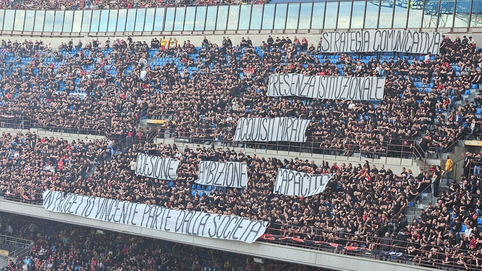 Milan, la Curva Sud contesta il club: cinque striscioni per un messaggio e uscita anticipata