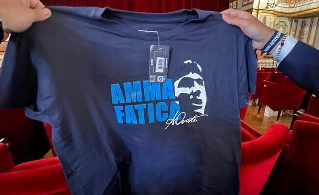 Da "Sarò con te" a "Amma fatica'". La frase in dialetto napoletano pronunciata da Antonio Conte nella sua prima dichiarazione ufficiale da nuovo allenatore del Napoli è già lo slogan del nuovo corso azzurro ed è stata ripresa su una t-shirt prodotta dal Napoli, che dovrebbe essere messa in vendita a breve: sulla maglia blu, insieme alla scritta "Amma fatica'", è stampato il volto di Conte con la sua firma. Una mossa che ricorda quella fatta nell'estate 2021 all'arrivo a Napoli dell'attuale ct della Nazionale italiana, Luciano Spalletti, quando sulle casacche da allenamento del Napoli fu stampata la scritta "Sarò con te... e tu non devi mollare", tratta da un noto coro della tifoseria organizzata napoletana.