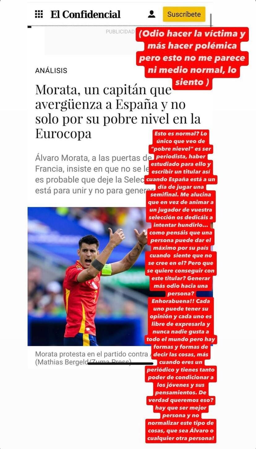 Lo spagnolo è stato attaccato dal giornale El Confidencial che ha titolato "Morata, un capitano che mette in imbarazzo la Spagna e non solo per il suo scarso livello agli Europei", non si è fatta attendere la risposta di Alice Campello