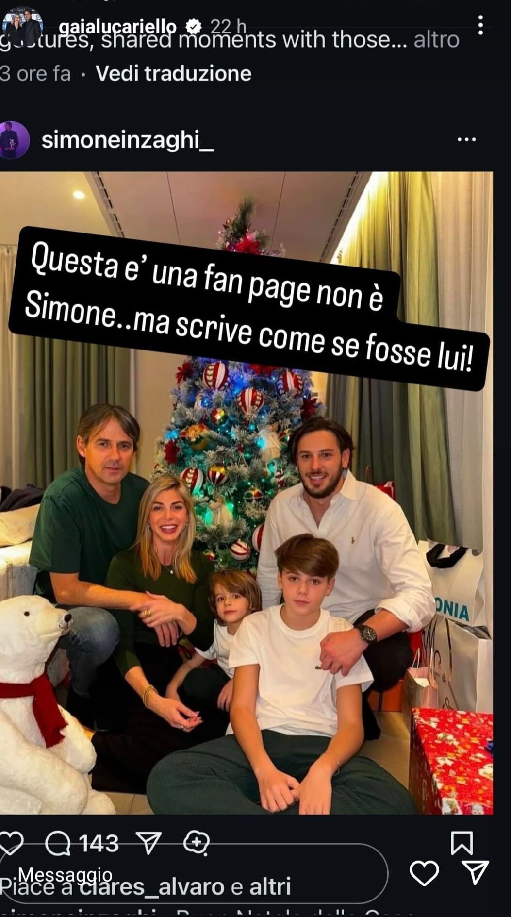 "Questa è una fanpage, non è Simone..ma scrive come se fosse lui!". Inizia così la denuncia social di Gaia Lucariello, compagna di Simone Inzaghi, che nel giorno di Natale ne ha approfittato per avvisare i seguaci per dell'esistenza di un finto profilo su X che si spaccia per Simone. "Scrive se fosse lui! Mi hanno detto che questo scemo scrive anche a tante ragazze" ha continuato la Lucariello, che sul proprio profilo Instagram condivide con il marito anche le gioie calcistiche dell'avventura interista. Al momento la pagina segnalata non risulta più attiva.