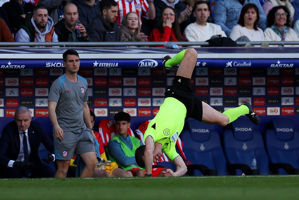 Un guardalinee a testa in giù per 'colpa' di una piroetta involontaria non si vede tutti i giorni. L'incredibile episodio durante la sfida di Liga tra Espanyol e Atletico Madrid. L’assistente Rodriguez Moreno è stato travolto da Giuliano Simeone mentre stava effettuando il riscaldamento a bordo campo in attesa della chiamata di papà Cholo per entrare in campo. La caduta è stata fragorosa ma fortunatamente Moreno si è alzato con le sue gambe e ha proseguito la partita. Qualche settimana fa era toccato ad Ancelotti, travolto a bordocampo proprio da Simeone durante il primo tempo del derby tra Atletico e Real. Il tecnico dei merengues, dopo un attimo di esitazione, si è subito ripreso e si è abbracciato con l'attaccante dei Colchoneros.