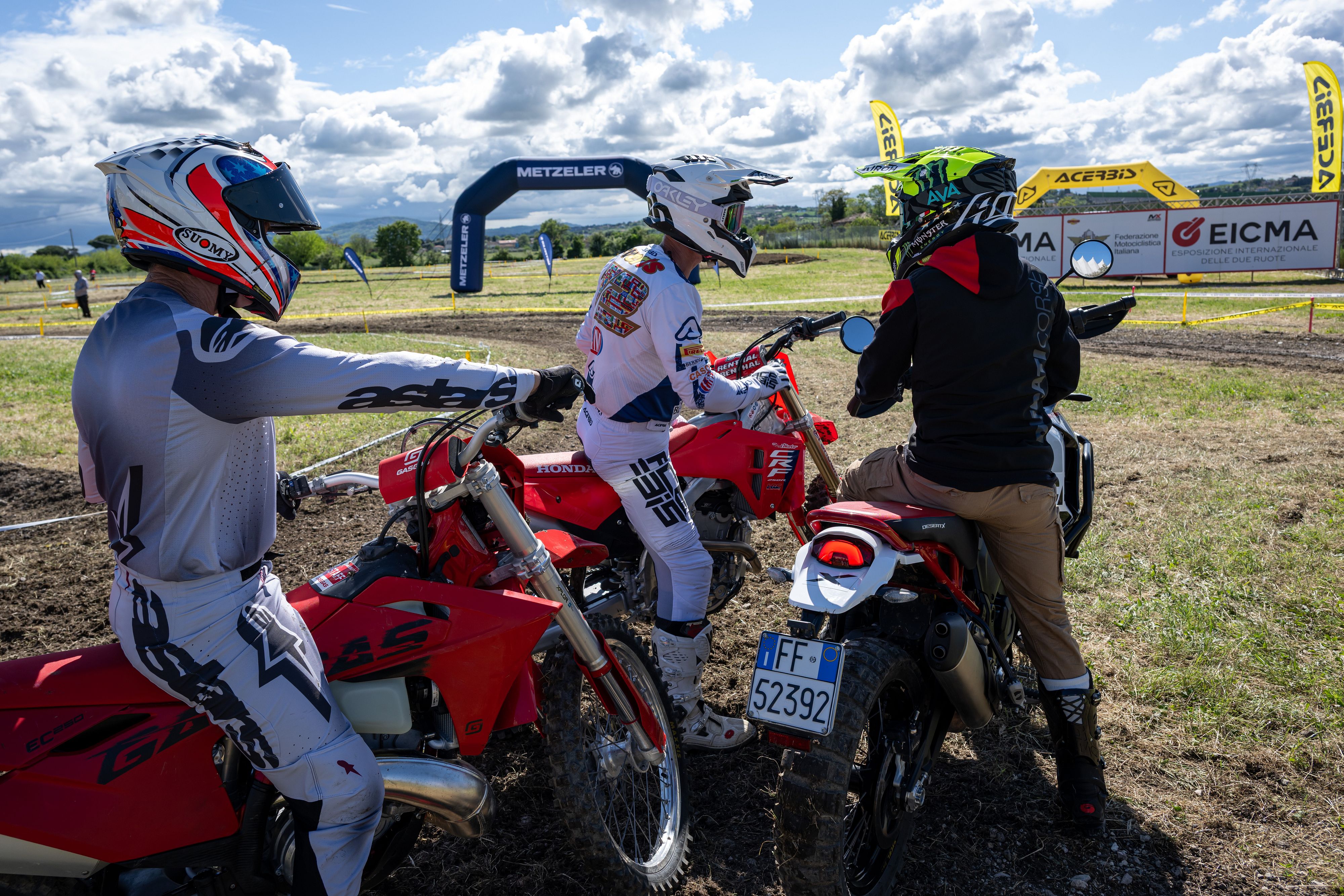 Antonio Cairoli, Stefan Everts e Troy Bayliss: un trio insolito insieme nella pista di offroad all'Eicma Riding Fest di Misano. Ducati, Honda e Gas Gas le moto utilizzate.