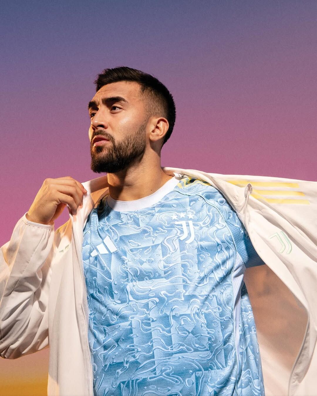 La Juventus ha presentato la seconda maglia per la stagione 2025/2026, che si ispira all'estate italiana, alle scintillanti acque costiere con la grafica color acquamarina e blu dall'effetto liquido. Gli accenti gialli sulle strisce dello sponsor tecnico, che scendono lungo le maniche richiamano gli alberi di limoni e i cieli azzurri e un classico colletto a girocollo bianco completa il design.